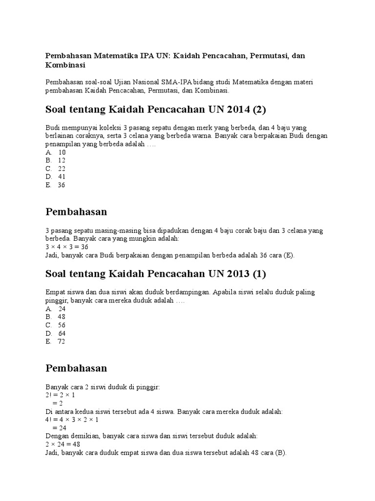 Soal soal kaidah pencacahan ipa. Soal uts matematika kelas 3 semester 2 th 2018 youtube. Pembahasan soal soal ujian nasional sma ipa bidang studi matematika dengan materi pembahasan kaidah pencacahan permutasi dan kombinasi. Pdf on may 15 2017 abdul azis abdillah and others published kumpulan soal dan pembahasan kombinatorik i find read and cite all the research you need on researchgate.