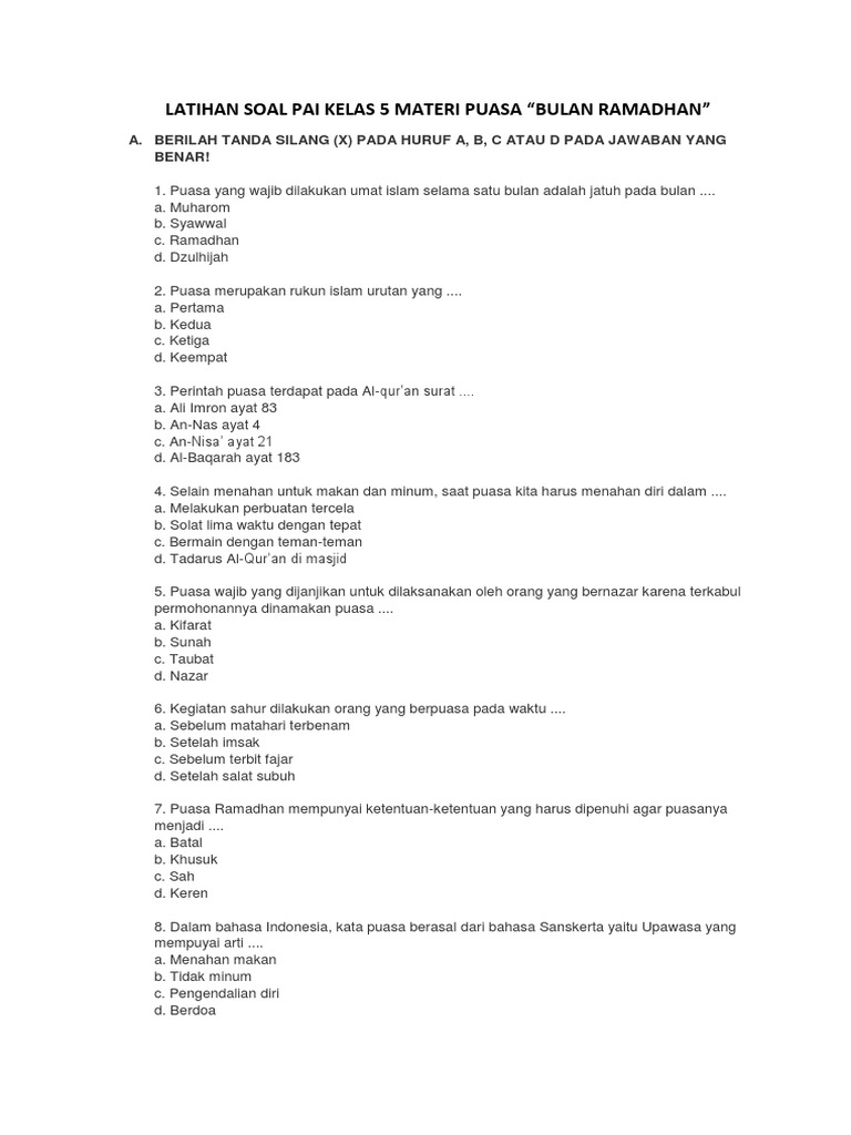Soal bab puasa kelas 8 mts. Adapun dalam artikel ini saya coba share soal Penilaian Tengah Semester Bahasa Arab MTs kelas 8 baik semestter ganjil maupun semester genap. Download soal pai kelas 5 sd bab 10 puasa wajib dan kunci. Silahkan dibaca dan dipelajari.
